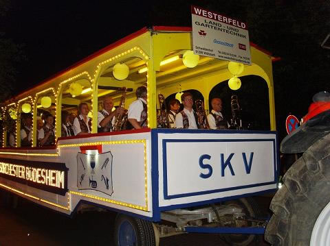 Um 21.00 Uhr setzte sich der Festumzug in Bewegung, traditionell angeführt von der Zugspitze des Blasorchesters Büdesheim. Auf dem mit vielen bunten Lämpchen geschmückten Konzertwagen gab es für die Musikanten keine Pause. Knapp 40 Musikstücke enthält das Büdesheimer Marsch- und Ständchen-Notenbuch, und so erklangen Schlag auf Schlag bekannte Titel wie ‚Die Hände zum Himmel’, ‚Ich hätt getanzt heut Nacht’ und ‚Bozener Bergsteiger Marsch’, bis sich der Festzug gegen 23.00 Uhr seinem Ende näherte.