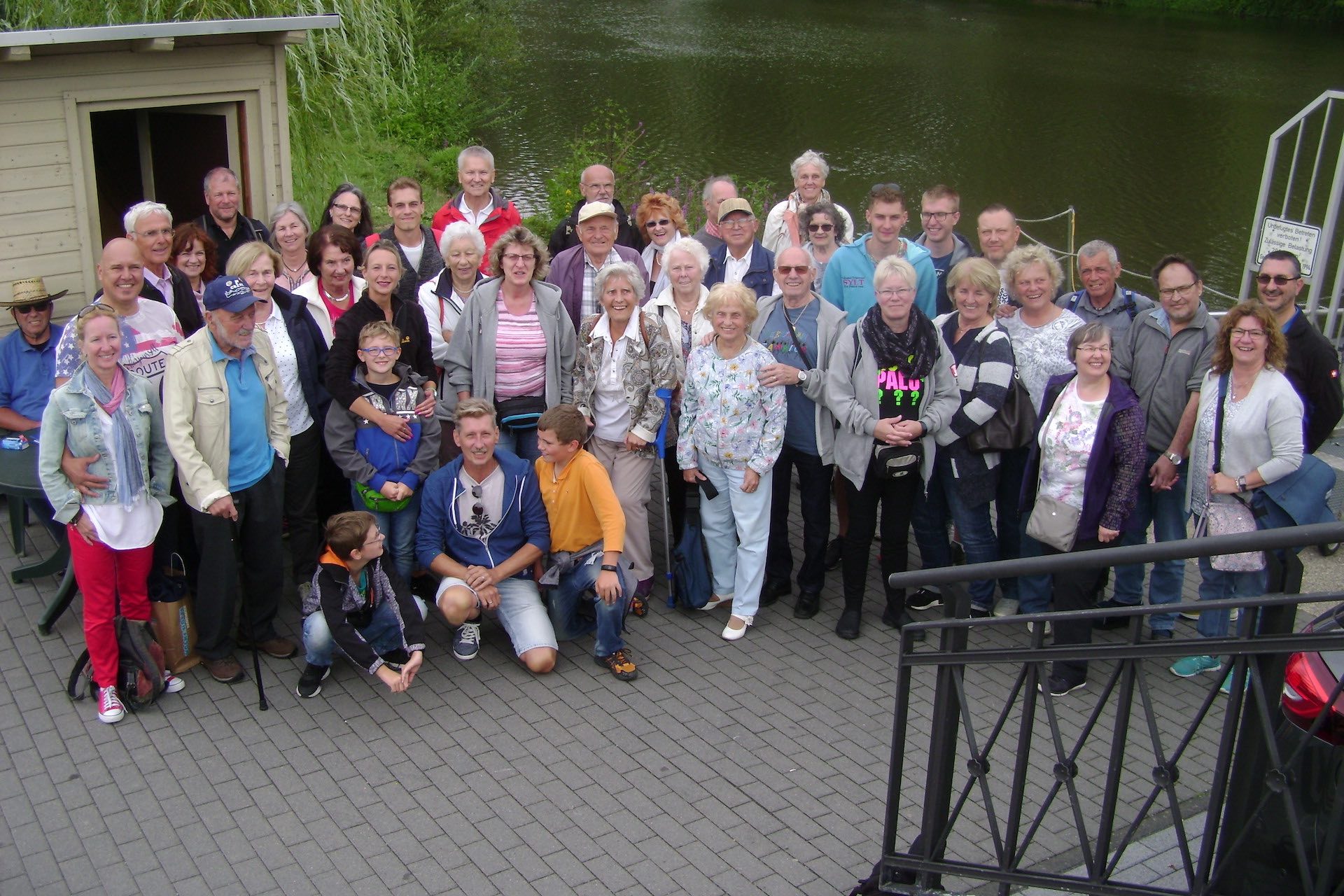 Abbildung: Blasorchester Büdesheim mit Fans vor der Floßanlegestelle in Melsungen.